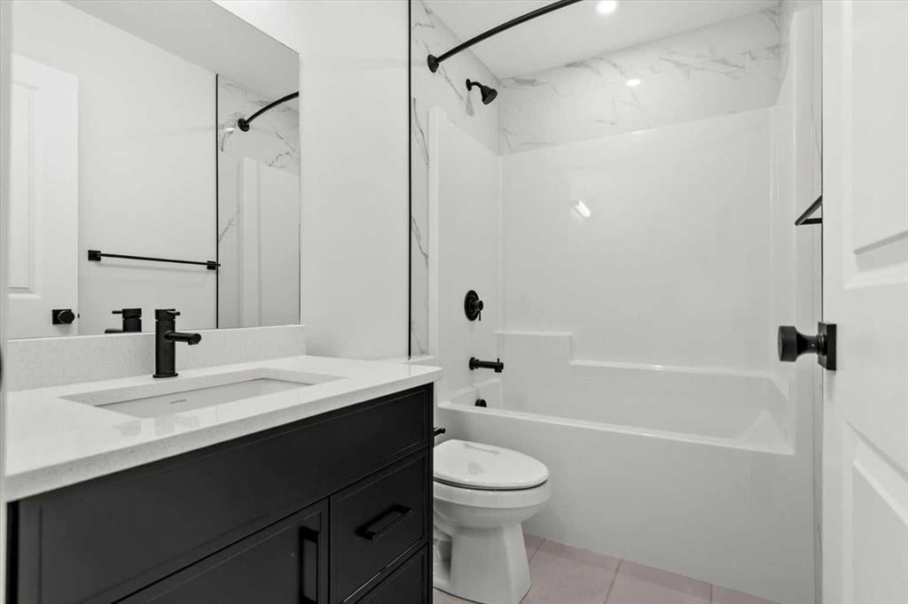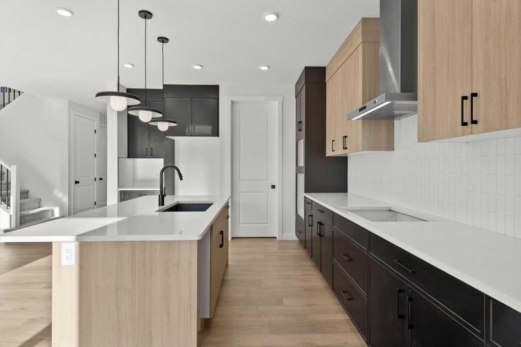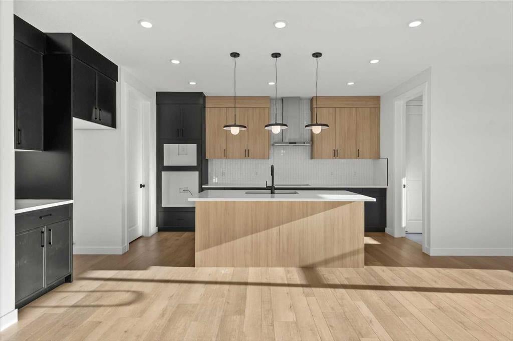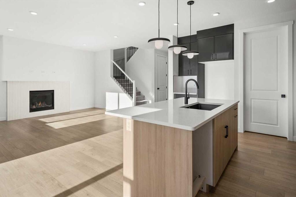 This beautifully designed modern build by Daytona Homes, set on a future lake facing street in Harmony, offers over 2100 sq. ft of thoughtfully designed living space. With exceptional curb appeal, striking black-and-white exterior accents, and a detached triple-car garage, this home makes a bold statement from the moment you arrive. Step inside to a bright, inviting interior with wide plank flooring throughout the main level. A private office is perfectly positioned by the front entrance, while the main-floor laundry and tucked-away half bath enhance everyday convenience. The heart of the home — the open-concept kitchen and living area — is flooded with natural light from expansive windows. The kitchen features natural wood cabinetry paired with sleek black accents, stainless steel appliances, quartz countertops, subway tile backsplash, and a large walk-in pantry. The living room offers a cozy fireplace with neutral, thoughtfully selected tile, seamlessly connecting to the expansive back deck. The rear yard is an open canvas ready for your personal landscaping ideas. Upstairs, the floor plan is designed for both privacy and functionality. A bright bonus room faces the future lake, while the primary suite is a true retreat, complete with a spacious walk-in closet and a luxurious five-piece ensuite with modern tile, freestanding tub, quartz countertops, and sleek black cabinetry and hardware. Two additional well-sized bedrooms share a four-piece bathroom, making the upper level ideal for family living. The basement is undeveloped, offering ample space to create a customized entertainment, recreation, or additional living area. Harmony is a vibrant, award-winning community known for its family-friendly atmosphere, scenic walking and biking trails, parks, playgrounds, and future lake access. Residents enjoy proximity to top-rated schools, the Rocky Mountains, shopping, dining, and recreational amenities, as well as community events that foster a strong neighbourhood spirit.This home perfectly blends modern living, thoughtful design, and a vibrant community lifestyle in one of Calgary’s most sought-after neighbourhoods.
