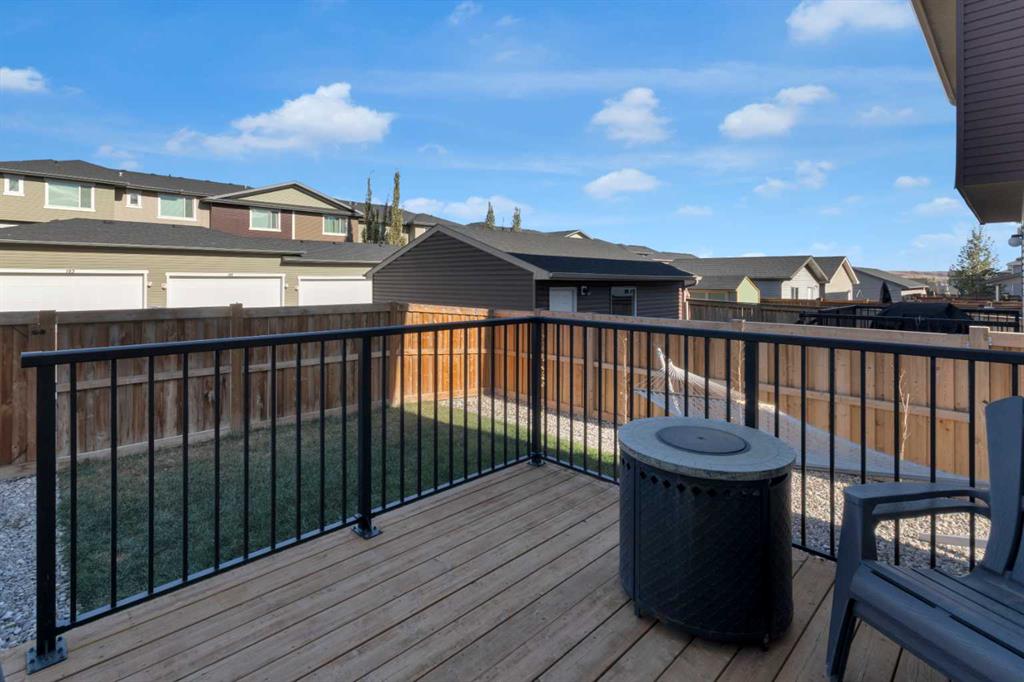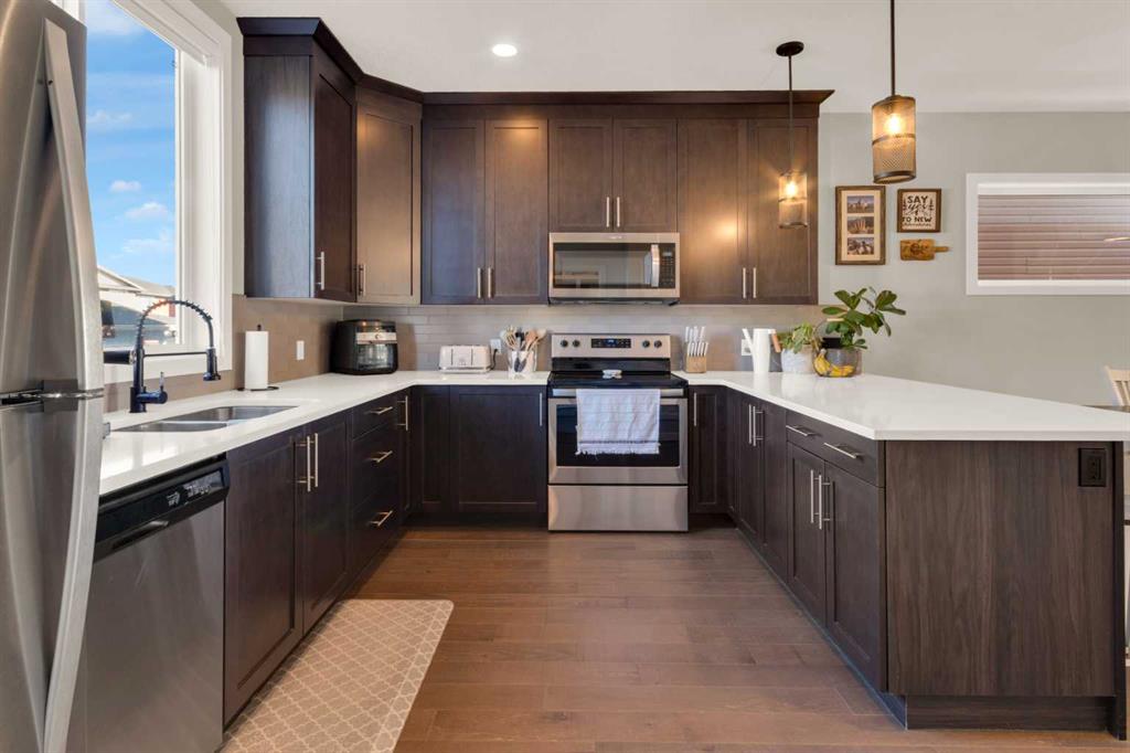 This bright and sunny, open-concept main floor plan embraces a warm & modern aesthetic with 9’ knock-down ceilings and hardwood floors. The spacious living room flows seamlessly into the dining area & kitchen boasting full-height cabinets, soft close drawers and doors, double door -built in pantry, quartz counters and generous breakfast bar. This dream kitchen is not only a joy to prepare meals in, but a space family & friends will gravitate to. Access the rear deck and fenced yard through the back entrance boasting convenient and attractive mud room with custom wood lockers and 2-piece bath. Upper level includes spacious, sunny, primary retreat, roomy ensuite with extra-long quartz counters and oversized walk-in shower. Convenient laundry space, 4-piece bath with quartz counters & two additional bedrooms complete the upper floor. custom site-built wooden shelving in closets throughout. Low E PVC windows, high efficiency furnace, HRV-Heat Recovery Ventilation system, and 50-gal gas hot water tank. Roughed in plumbing in basement and double-car, gravelled parking pad off paved lane for future development. Enjoy the south facing front covered porch year-round, the miles of pathways throughout the community and hundreds of acres of nature reserve. Walking distance to school, parks, shopping & transit and easy access in and out of the community with two entrance points.