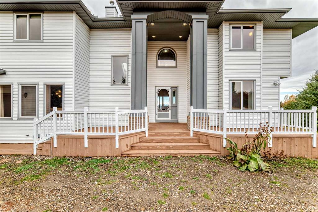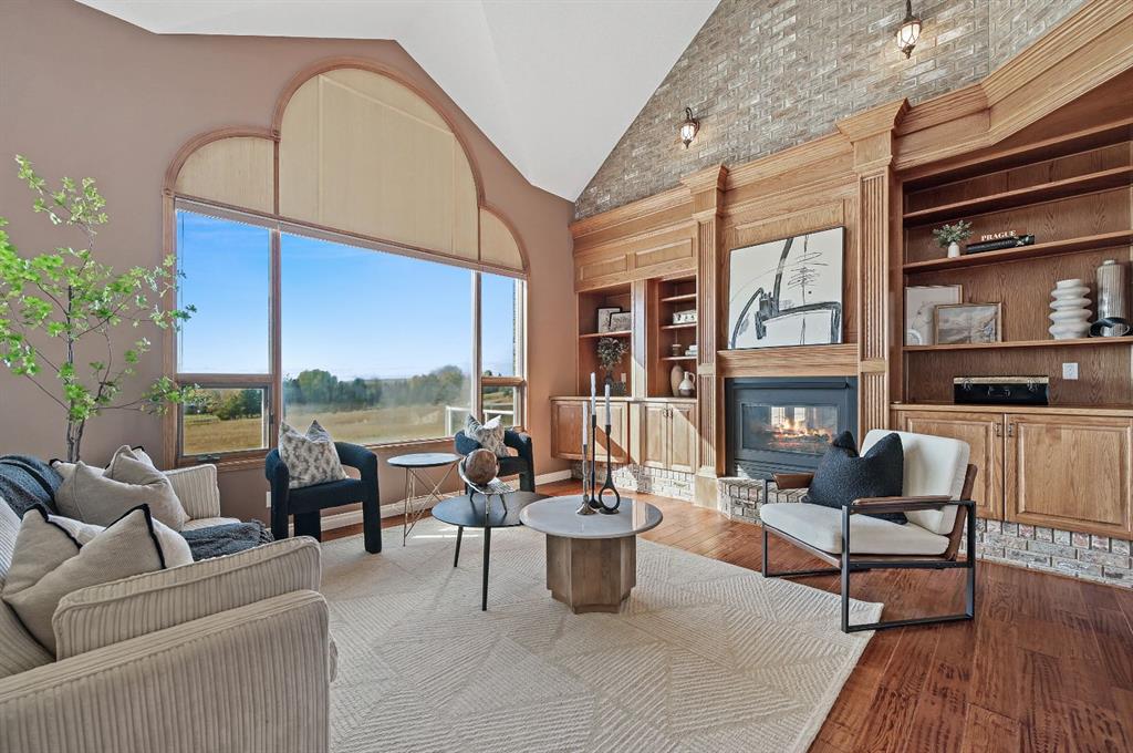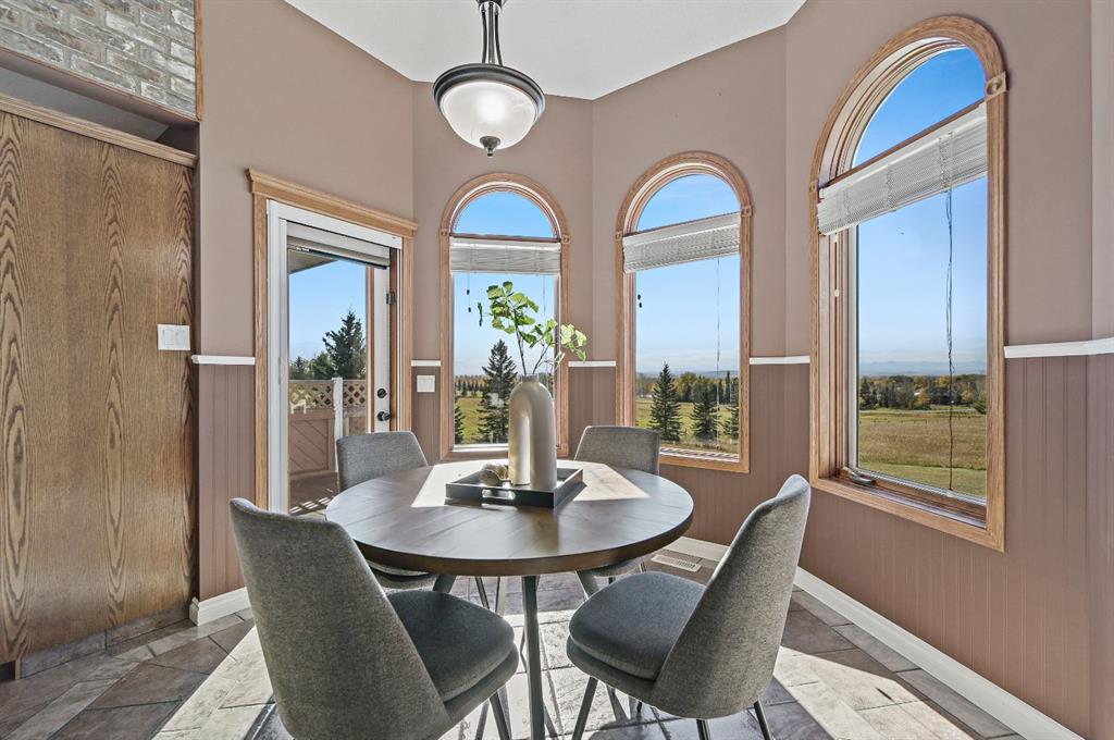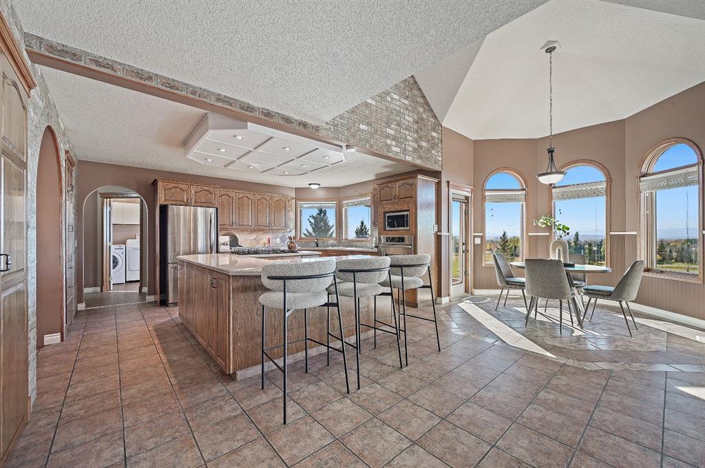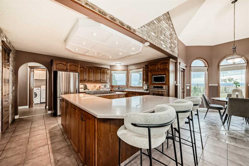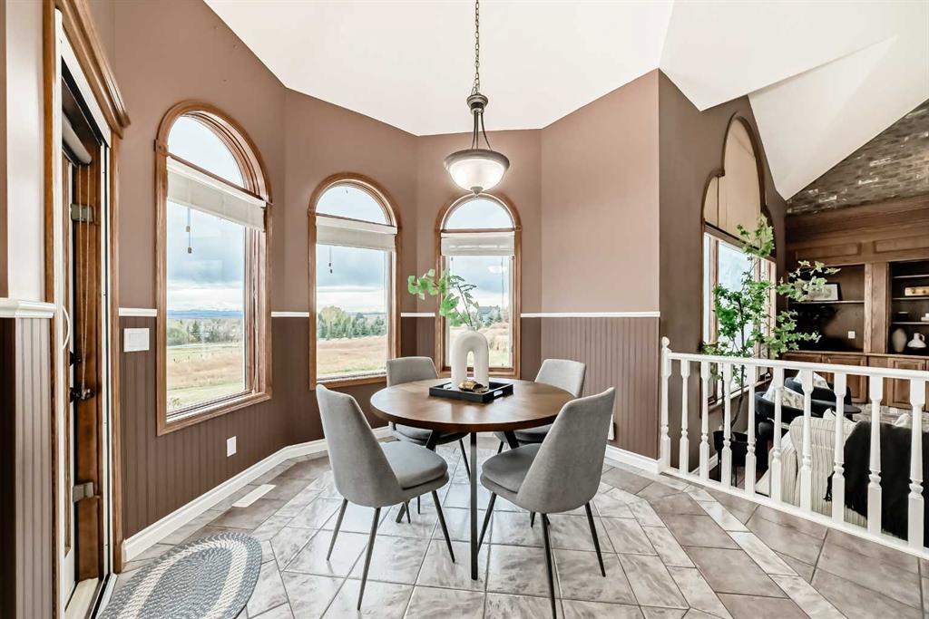 breathtaking estate where sophistication meets serenity, just 30 minutes from downtown Calgary and moments from Okotoks. Set on nearly 5 acres of beautifully landscaped land, this custom-built two-storey home captures the essence of country elegance with panoramic mountain views that stretch endlessly across the horizon. The moment you arrive, you’re greeted by a grand circular drive and timeless exterior that sets the tone for what lies inside. A barrel-vaulted entryway leads to an inviting open-concept layout, blending warm wood tones, soaring ceilings, and picture windows that frame the surrounding countryside. The gourmet kitchen is a chef’s dream — featuring an expansive island with gas cooktop, quartz counters, rich cabinetry, and brick archways that add character and charm. Flowing seamlessly into the formal dining and great room, this space is designed for both intimate dinners and elegant gatherings. Upstairs, the primary suite is a private retreat with stunning views, a luxurious spa-inspired ensuite, and walk-in closet. Two additional bedrooms share a stylish Jack-and-Jill bath, while the fully finished lower level offers 9’ ceilings, a large family room, games area, and custom-built bar — perfect for entertaining. Outside, enjoy evenings on the deck surrounded by mature trees and endless skies. This property captures everything buyers dream of in an acreage: luxury, privacy, and proximity — only minutes to town yet worlds away from the bustle.