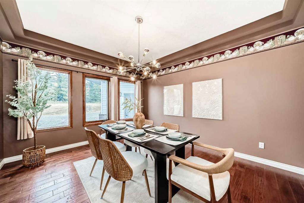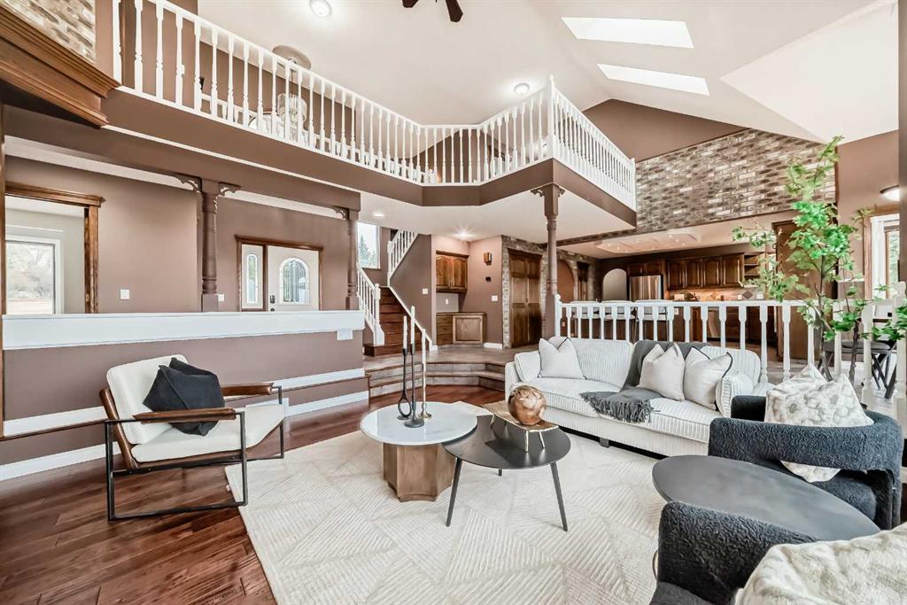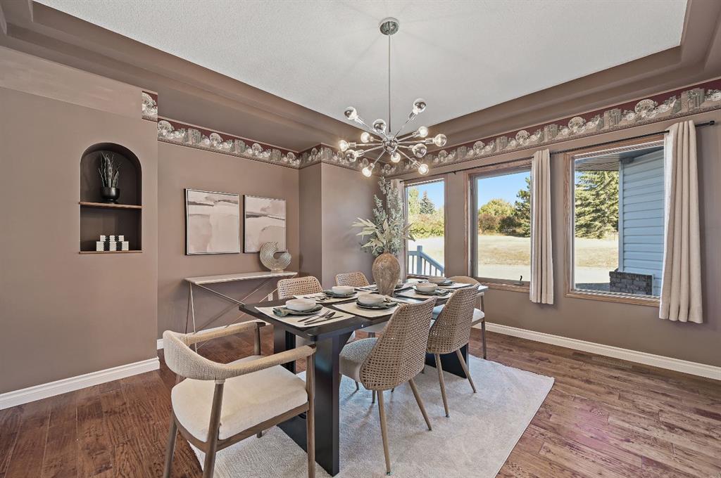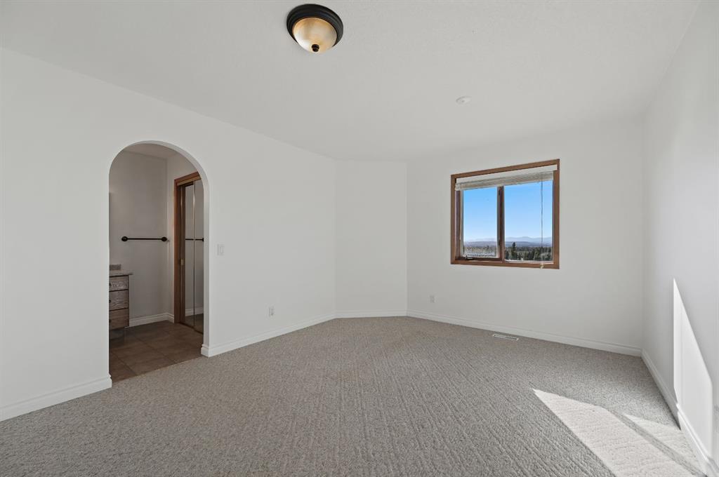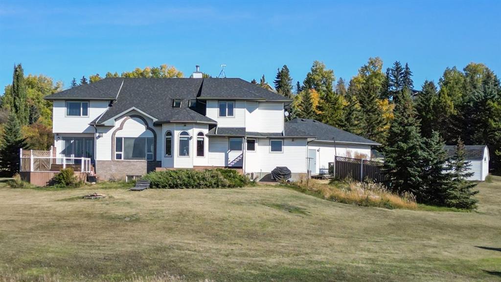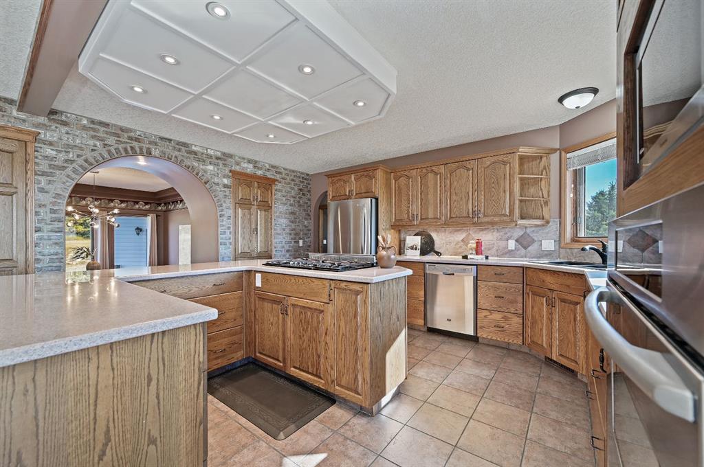 breathtaking estate where sophistication meets serenity, just 30 minutes from downtown Calgary and moments from Okotoks. Set on nearly 5 acres of beautifully landscaped land, this custom-built two-storey home captures the essence of country elegance with panoramic mountain views that stretch endlessly across the horizon. The moment you arrive, you’re greeted by a grand circular drive and timeless exterior that sets the tone for what lies inside. A barrel-vaulted entryway leads to an inviting open-concept layout, blending warm wood tones, soaring ceilings, and picture windows that frame the surrounding countryside. The gourmet kitchen is a chef’s dream — featuring an expansive island with gas cooktop, quartz counters, rich cabinetry, and brick archways that add character and charm. Flowing seamlessly into the formal dining and great room, this space is designed for both intimate dinners and elegant gatherings. Upstairs, the primary suite is a private retreat with stunning views, a luxurious spa-inspired ensuite, and walk-in closet. Two additional bedrooms share a stylish Jack-and-Jill bath, while the fully finished lower level offers 9’ ceilings, a large family room, games area, and custom-built bar — perfect for entertaining. Outside, enjoy evenings on the deck surrounded by mature trees and endless skies. This property captures everything buyers dream of in an acreage: luxury, privacy, and proximity — only minutes to town yet worlds away from the bustle.
