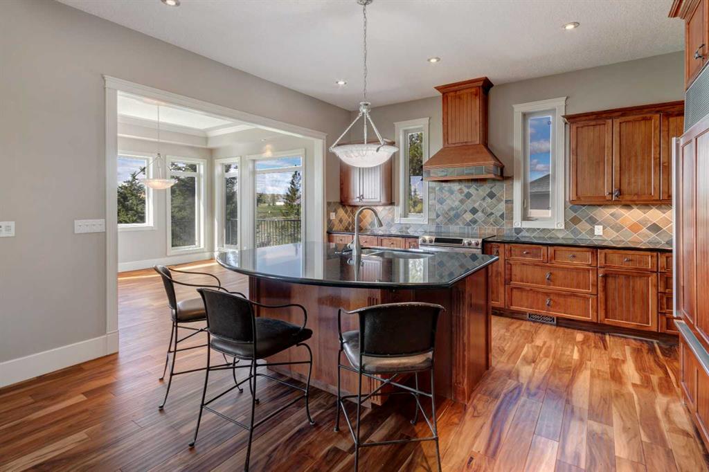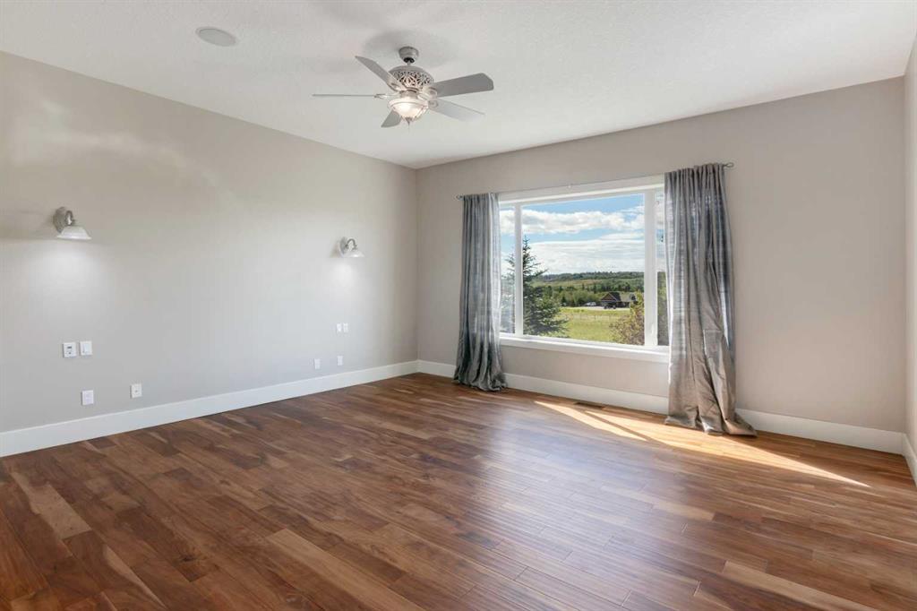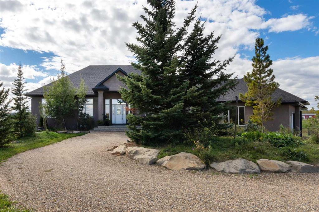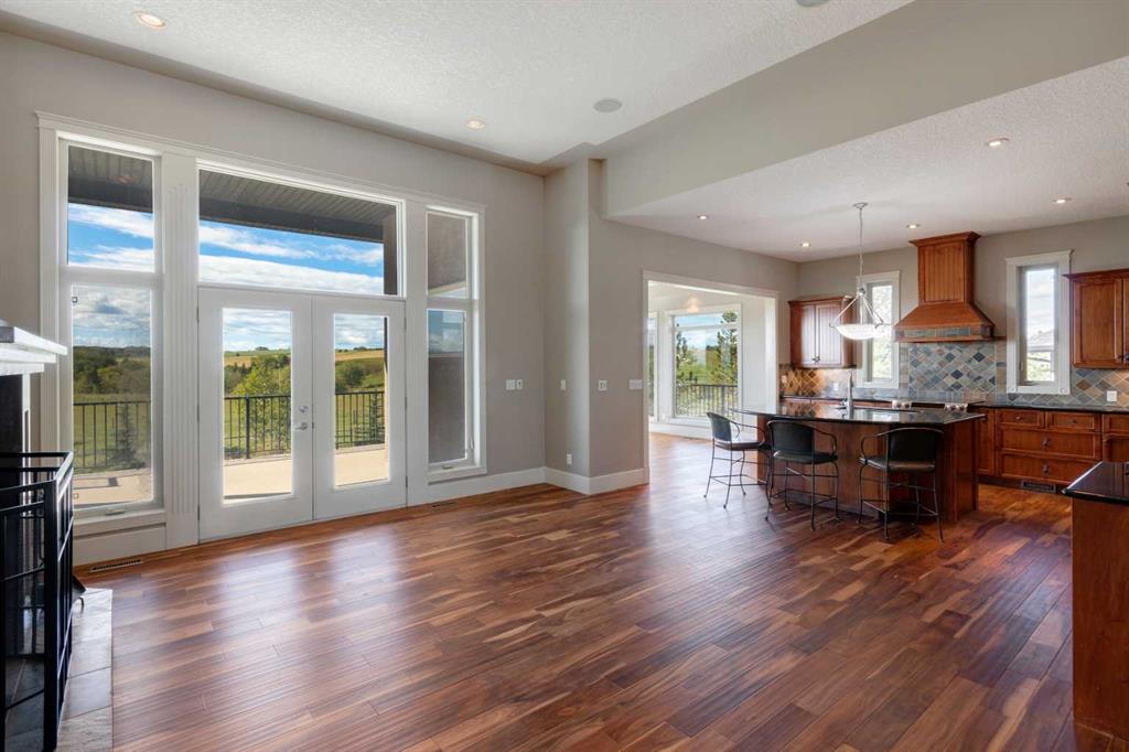 Experience seclusion and tranquility on this private 15 acre estate. Bordering the Horse Creek environmental reserve, sweeping views of rolling hills and countryside pasture impress from every angle. Access miles of walking and equestrian trails just off property which provide access to serene nature and panoramic mountain views. This thoughtfully planned, elegant Bungalow provides over 5500 total developed square feet and the 1700 sq. ft. barn/shop frames the perfect backdrop for an equestrian setting or workshop away from the hustle and bustle of the city. This extraordinary property is located minutes away from Cochrane, offering the perfect investment for the discerning buyer interested in having a country-quiet, yet city close acreage lifestyle with all the luxuries, along with the unique and incredibly valuable ability to subdivide the property. This is truly a lifestyle of elegance, privacy, and enduring value. Crafted with quality, this residence is luxurious western country living at its finest, boasting meticulous, timeless design with an expansive interior that will truly awe you. Stepping into the entrance you’re greeted by soaring 14’ ceilings into an inviting haven perfect for hosting memorable gatherings with friends and family. New hardwood floors throughout the living room, kitchen and dining room, and a grand wood-burning fireplace are warm and inviting. For the chef in the family, the kitchen is a dream come true, featuring a Subzero fridge, huge island, prep sink, and ample storage. The primary bedroom offers new hardwood flooring and stunning sunset mountain views. The ensuite is a sanctuary unto itself, featuring a deep soaker tub, a steam shower, double sinks, and an enviable closet. Descend the beautiful spiral staircase to the walkout lower level, where you'll once again be struck by the attention to detail. A wall of expansive windows illuminates a bright seating area and patio, roughed in for hot tub. Adjacent to the custom designed bar, you'll discover a wine room where you can collect, showcase, and savour your favourite wines. This level features a family room with snooker table, a dedicated theatre room with gas fireplace, gym area and a sunroom/den. In addition, for the independent family member or caretaker is a legal one-bedroom suite with a full Kitchen and separate entrance. The oversized triple car garage is also equipped with in-floor heat and has ample space to accommodate a full-size truck. In addition, the heated barn/shop awaits with 576 sq. ft. attached overhang ideal for hay storage or parking oversized equipment. Currently set up for horse barn with six portable indoor stalls, interior standpipe for water, 16’ aisle way, large, separate tack/tool room, one man door and two oversized doors. Potential space for a 125 x 250 riding arena adjacent to the barn. Two exterior standpipes, plus one automatic waterer. Cross fencing and paddocks with three plywood horse shelters.