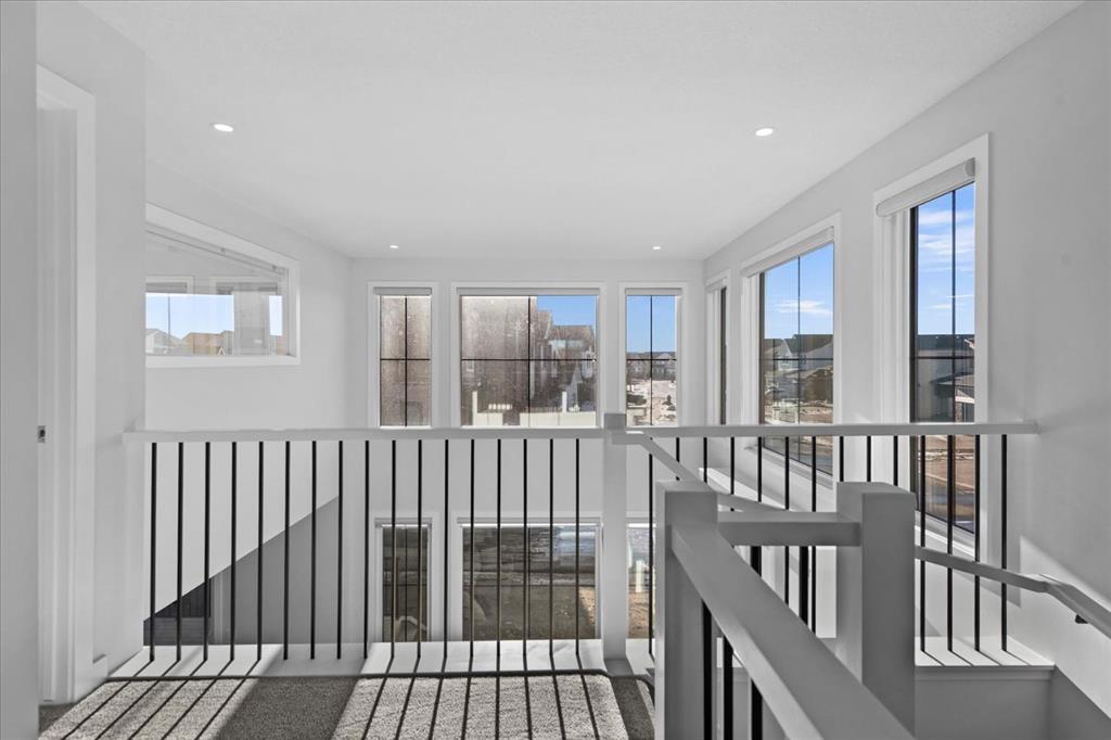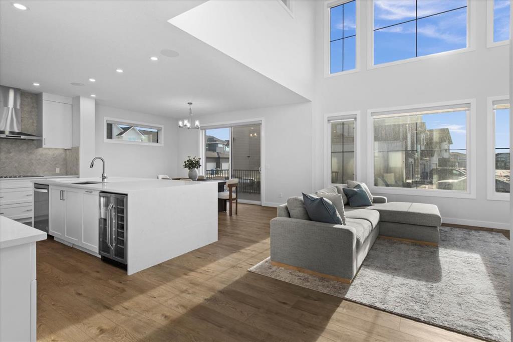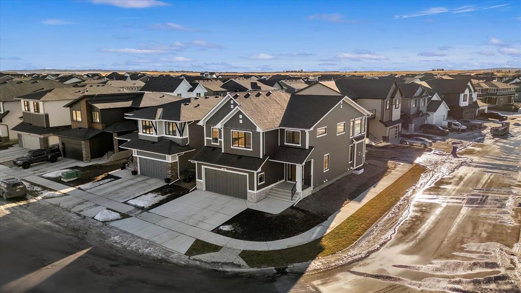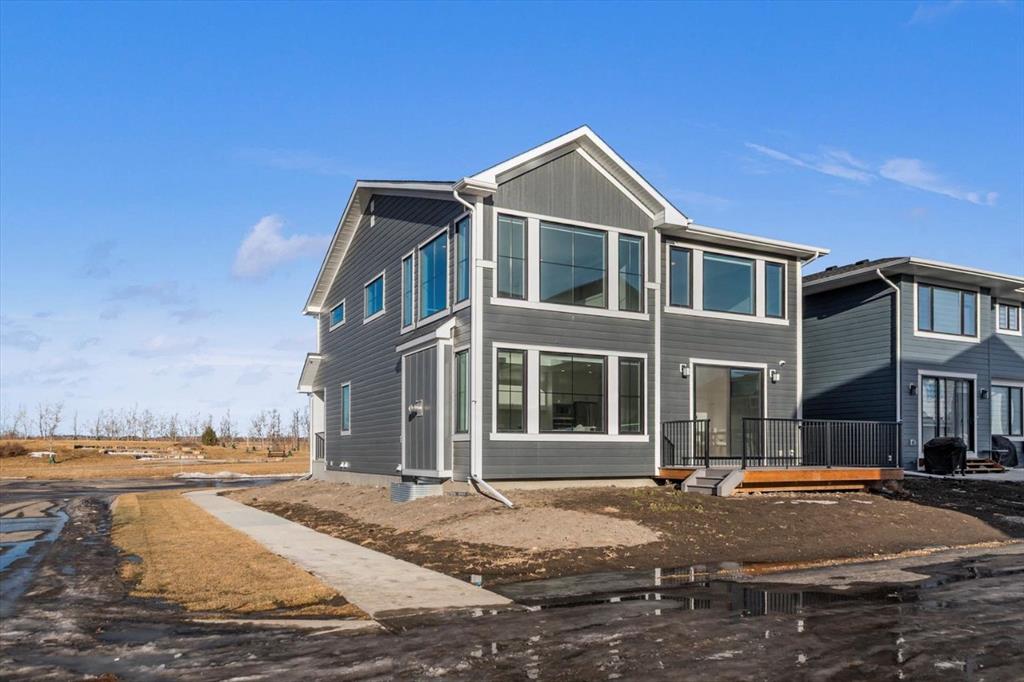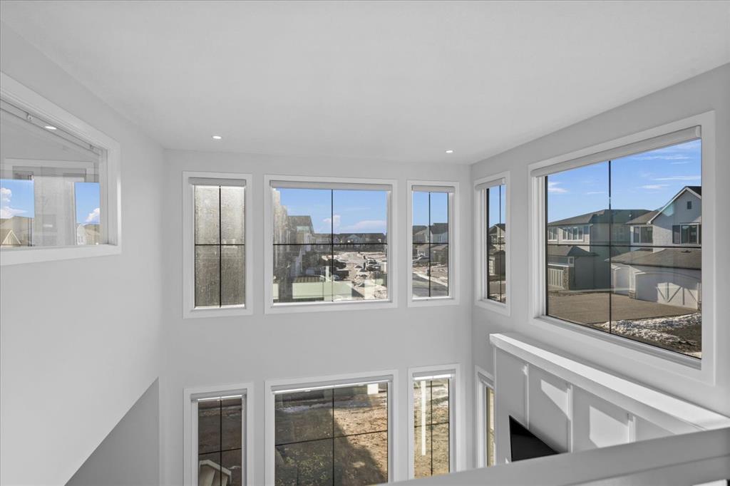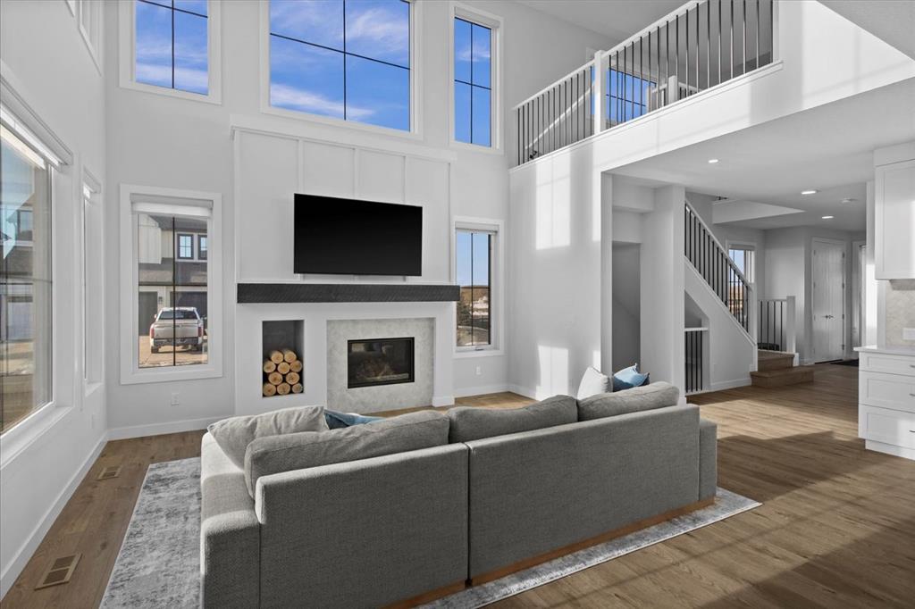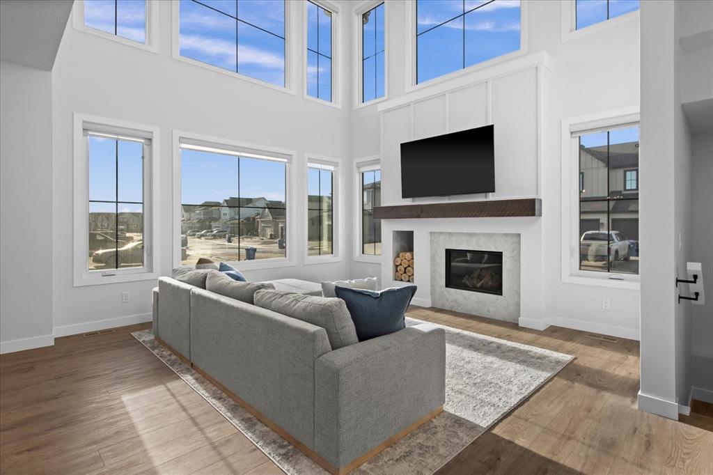 A beautifully crafted 2025-built Amber model by Sterling Homes, ideally situated on a premium corner lot in the sought-after community of Harmony. Offering over 3,750 sq ft of fully developed living space, 5 bedrooms, and more than $120,000 in upgrades, this home is truly exceptional. Barely lived in and meticulously maintained, it shows like new and is ready for immediate possession. The modern stone exterior and clean architectural lines create a striking first impression, while the corner-lot placement allows for large windows throughout and an open, airy feel. Located directly across from green space and pathways, the setting offers privacy and a strong connection to the outdoors. Inside, the open-concept main floor is designed for everyday comfort and entertaining, featuring soaring ceilings and wide plank flooring throughout the main and upper levels. The living room is anchored by a stunning floor-to-ceiling fireplace that serves as a statement feature, adding warmth and architectural presence. A private main-floor office and stylish powder room add functionality without disrupting the flow. The kitchen is the heart of the home, designed for gathering and hosting, with quartz countertops, an oversized island, stainless steel appliances, a beverage fridge, and a walk-in pantry, all open to the main living and dining areas. A custom mudroom with built-ins off the double attached garage keeps daily life organized. Upstairs, the home opens to below, enhancing the sense of space. The primary retreat offers a peaceful escape with large windows, including an additional upgraded west-facing window positioned to capture sunset and mountain views, a spacious walk-in closet, and a spa-inspired 5-piece ensuite with quartz countertops, a freestanding soaker tub, and a walk-in shower with built-ins. Two additional generously sized bedrooms with walk-in closets are located on the opposite side of the level, alongside a well-appointed 5-piece bathroom. The bonus room features built-in benches and large windows overlooking the green space and park, creating an inviting space for relaxed family time, while the upper laundry room is conveniently located nearby. The fully finished basement completes the home with a large recreation area perfect for games nights and entertaining, a wet bar, and double French doors leading to a versatile space ideal as a private theatre, home office, or guest room, along with a fifth bedroom and full bathroom. Built with family living in mind, this home offers generous spaces and a layout that supports everyday routines. Outside, a rear deck invites summer evenings, while the unfinished landscaping provides a blank canvas for your outdoor vision. All of this is paired with the exceptional amenities Harmony is known for, including lake access, golf, scenic pathways, and a vibrant community atmosphere.