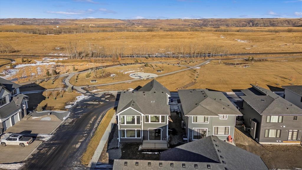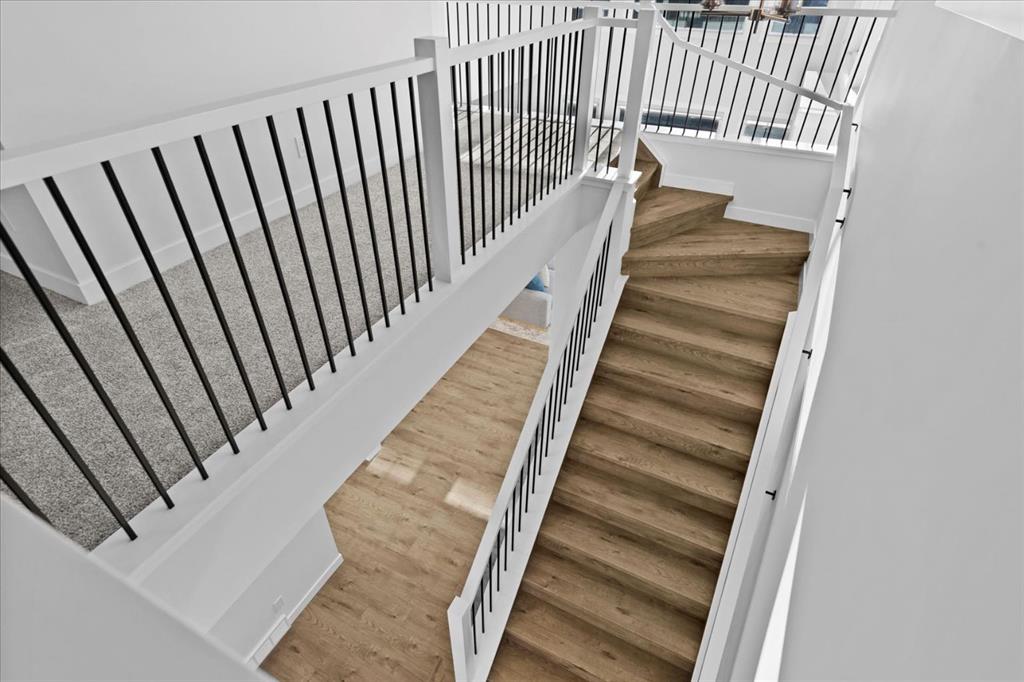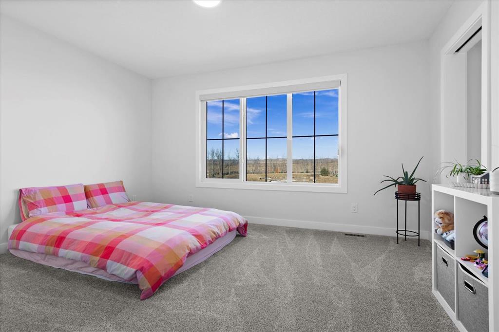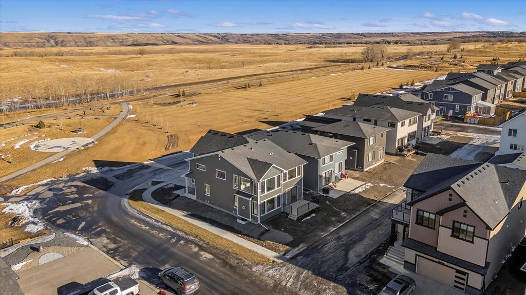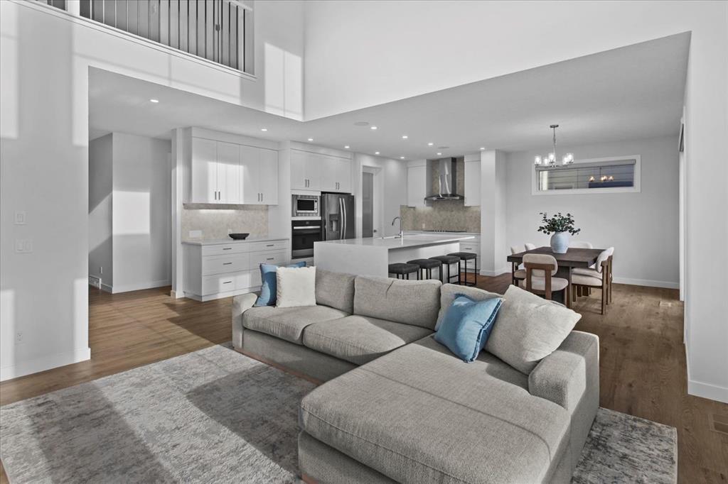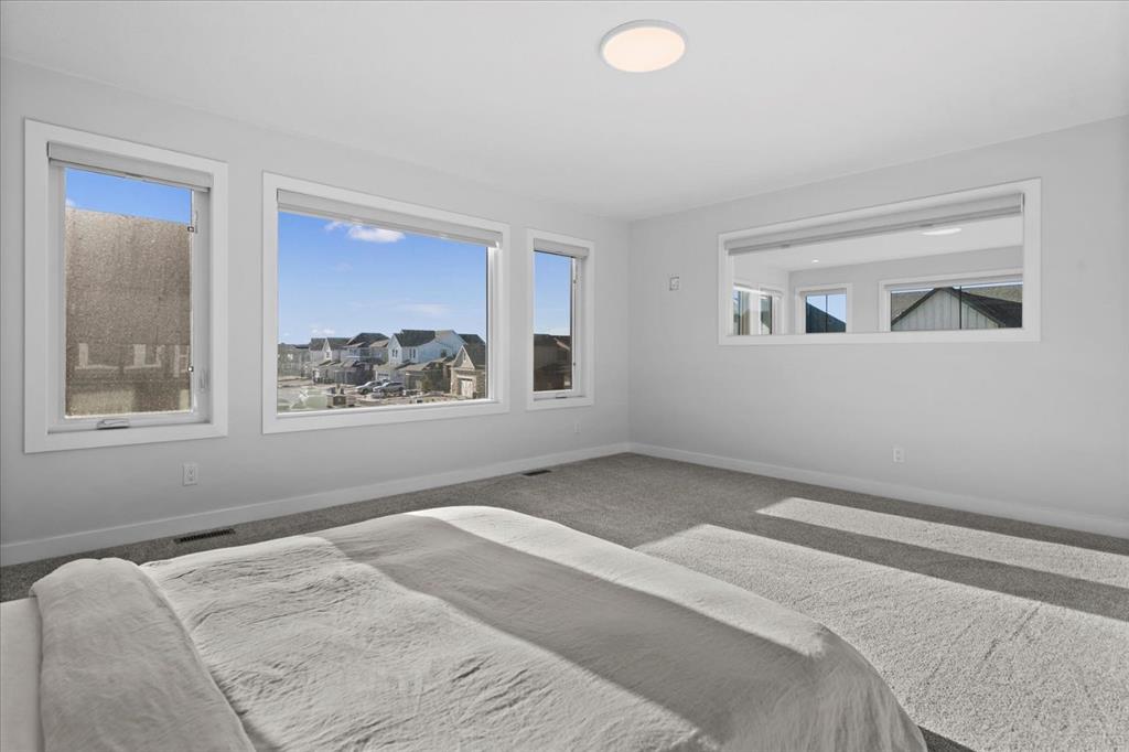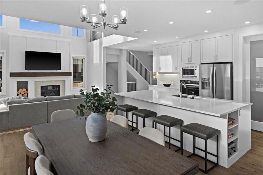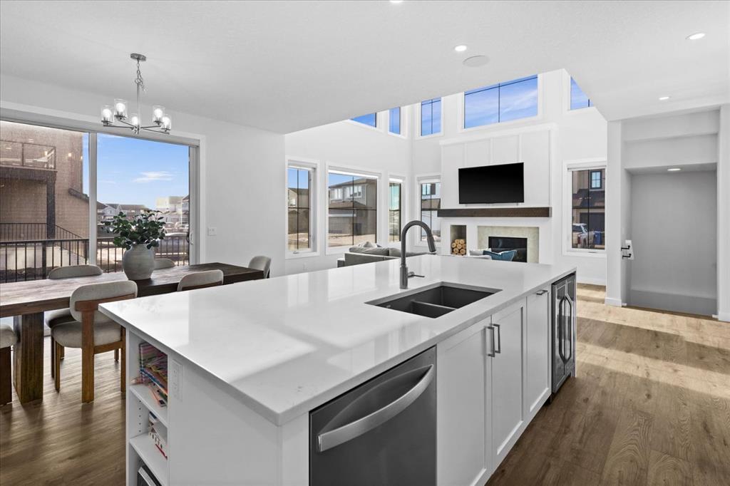 A beautifully crafted 2025-built Amber model by Sterling Homes, ideally situated on a premium corner lot in the sought-after community of Harmony. Offering over 3,750 sq ft of fully developed living space, 5 bedrooms, and more than $120,000 in upgrades, this home is truly exceptional. Barely lived in and meticulously maintained, it shows like new and is ready for immediate possession. The modern stone exterior and clean architectural lines create a striking first impression, while the corner-lot placement allows for large windows throughout and an open, airy feel. Located directly across from green space and pathways, the setting offers privacy and a strong connection to the outdoors. Inside, the open-concept main floor is designed for everyday comfort and entertaining, featuring soaring ceilings and wide plank flooring throughout the main and upper levels. The living room is anchored by a stunning floor-to-ceiling fireplace that serves as a statement feature, adding warmth and architectural presence. A private main-floor office and stylish powder room add functionality without disrupting the flow. The kitchen is the heart of the home, designed for gathering and hosting, with quartz countertops, an oversized island, stainless steel appliances, a beverage fridge, and a walk-in pantry, all open to the main living and dining areas. A custom mudroom with built-ins off the double attached garage keeps daily life organized. Upstairs, the home opens to below, enhancing the sense of space. The primary retreat offers a peaceful escape with large windows, including an additional upgraded west-facing window positioned to capture sunset and mountain views, a spacious walk-in closet, and a spa-inspired 5-piece ensuite with quartz countertops, a freestanding soaker tub, and a walk-in shower with built-ins. Two additional generously sized bedrooms with walk-in closets are located on the opposite side of the level, alongside a well-appointed 5-piece bathroom. The bonus room features built-in benches and large windows overlooking the green space and park, creating an inviting space for relaxed family time, while the upper laundry room is conveniently located nearby. The fully finished basement completes the home with a large recreation area perfect for games nights and entertaining, a wet bar, and double French doors leading to a versatile space ideal as a private theatre, home office, or guest room, along with a fifth bedroom and full bathroom. Built with family living in mind, this home offers generous spaces and a layout that supports everyday routines. Outside, a rear deck invites summer evenings, while the unfinished landscaping provides a blank canvas for your outdoor vision. All of this is paired with the exceptional amenities Harmony is known for, including lake access, golf, scenic pathways, and a vibrant community atmosphere.
