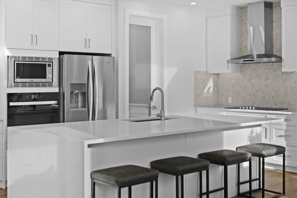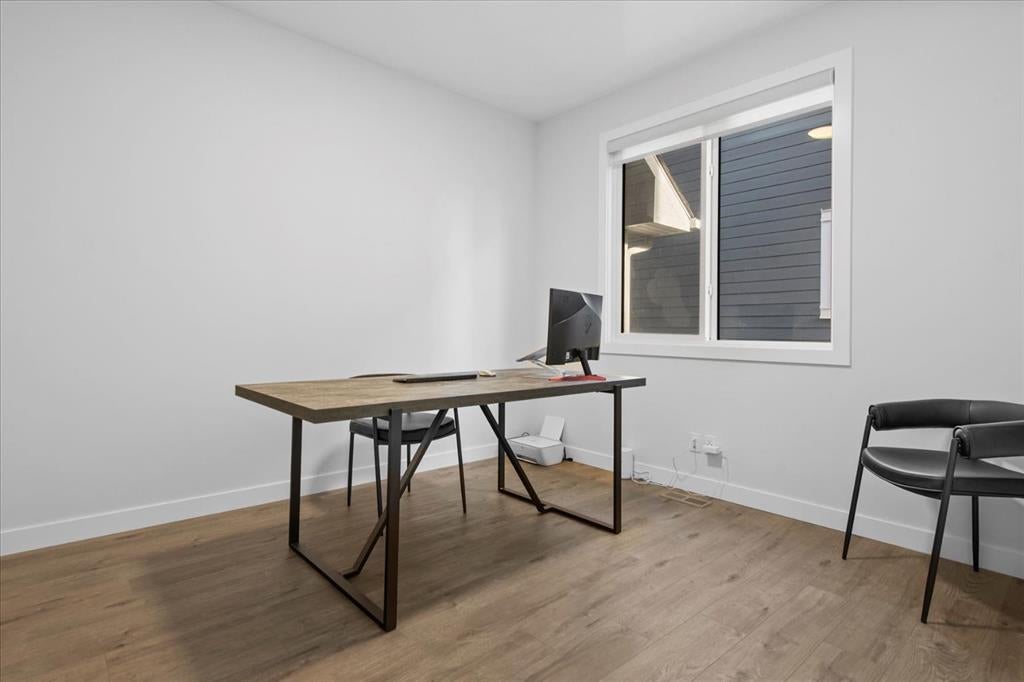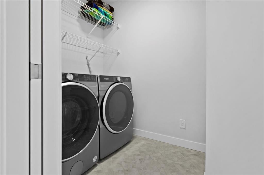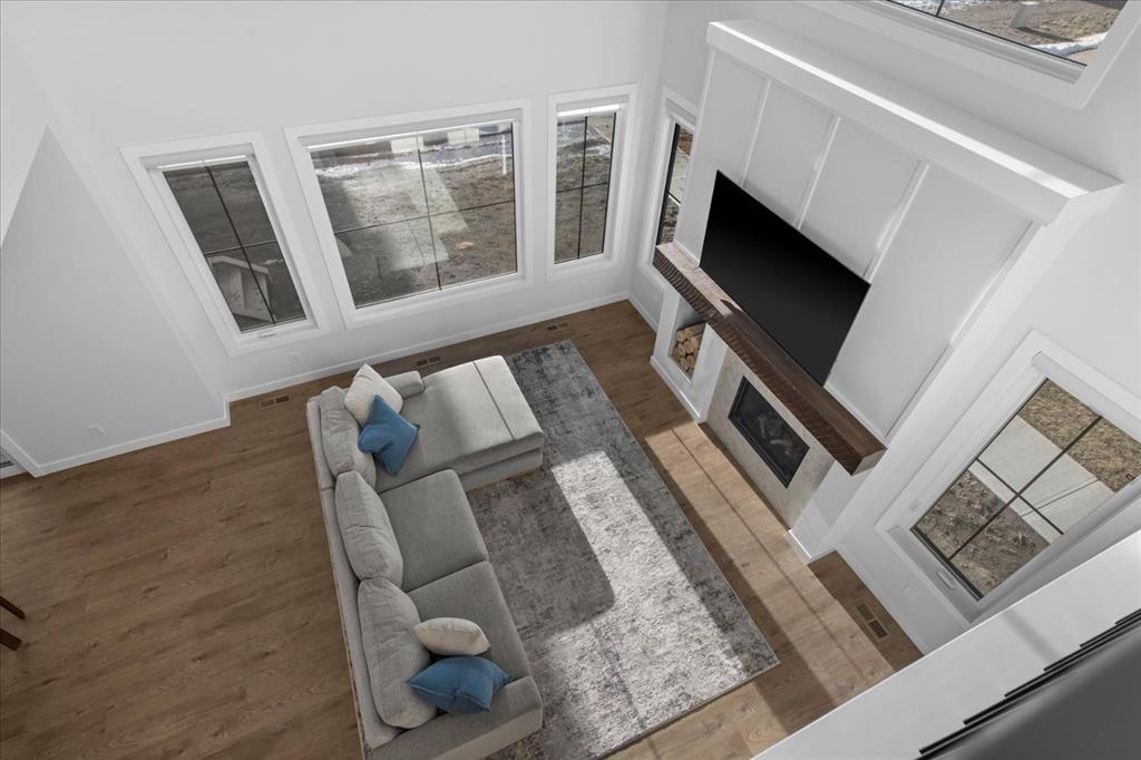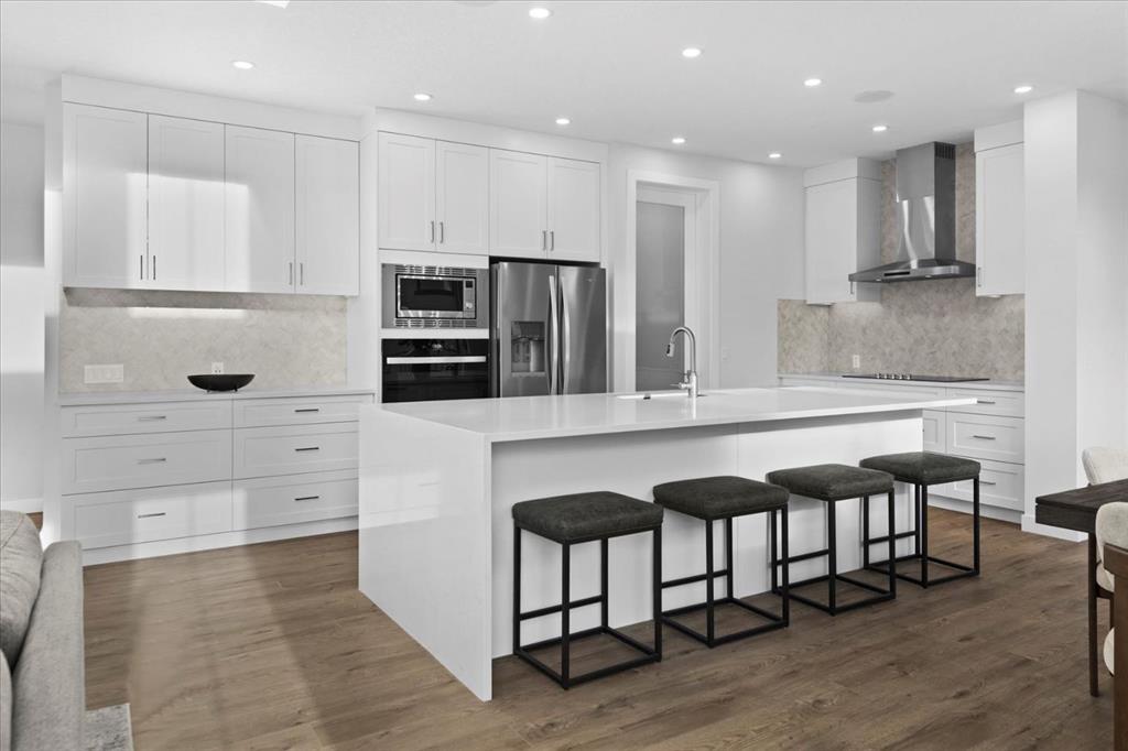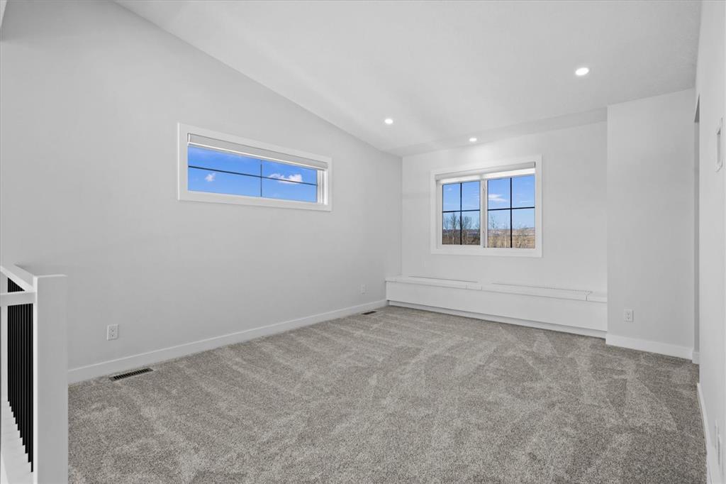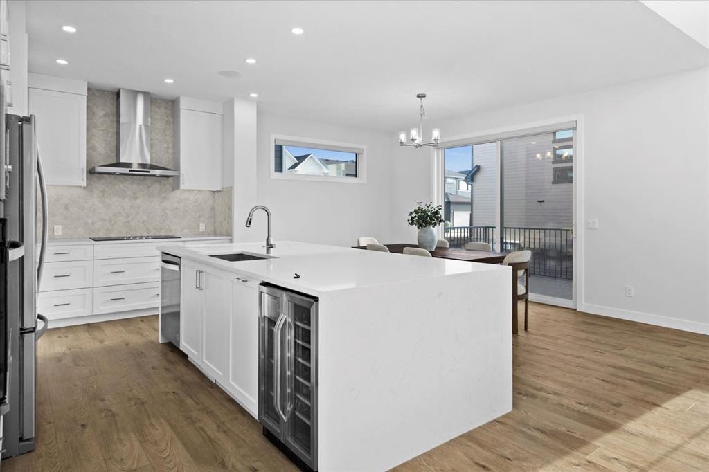 A beautifully crafted 2025-built Amber model by Sterling Homes, ideally situated on a premium corner lot in the sought-after community of Harmony. Offering over 3,750 sq ft of fully developed living space, 5 bedrooms, and more than $120,000 in upgrades, this home is truly exceptional. Barely lived in and meticulously maintained, it shows like new and is ready for immediate possession. The modern stone exterior and clean architectural lines create a striking first impression, while the corner-lot placement allows for large windows throughout and an open, airy feel. Located directly across from green space and pathways, the setting offers privacy and a strong connection to the outdoors. Inside, the open-concept main floor is designed for everyday comfort and entertaining, featuring soaring ceilings and wide plank flooring throughout the main and upper levels. The living room is anchored by a stunning floor-to-ceiling fireplace that serves as a statement feature, adding warmth and architectural presence. A private main-floor office and stylish powder room add functionality without disrupting the flow. The kitchen is the heart of the home, designed for gathering and hosting, with quartz countertops, an oversized island, stainless steel appliances, a beverage fridge, and a walk-in pantry, all open to the main living and dining areas. A custom mudroom with built-ins off the double attached garage keeps daily life organized. Upstairs, the home opens to below, enhancing the sense of space. The primary retreat offers a peaceful escape with large windows, including an additional upgraded west-facing window positioned to capture sunset and mountain views, a spacious walk-in closet, and a spa-inspired 5-piece ensuite with quartz countertops, a freestanding soaker tub, and a walk-in shower with built-ins. Two additional generously sized bedrooms with walk-in closets are located on the opposite side of the level, alongside a well-appointed 5-piece bathroom. The bonus room features built-in benches and large windows overlooking the green space and park, creating an inviting space for relaxed family time, while the upper laundry room is conveniently located nearby. The fully finished basement completes the home with a large recreation area perfect for games nights and entertaining, a wet bar, and double French doors leading to a versatile space ideal as a private theatre, home office, or guest room, along with a fifth bedroom and full bathroom. Built with family living in mind, this home offers generous spaces and a layout that supports everyday routines. Outside, a rear deck invites summer evenings, while the unfinished landscaping provides a blank canvas for your outdoor vision. All of this is paired with the exceptional amenities Harmony is known for, including lake access, golf, scenic pathways, and a vibrant community atmosphere.