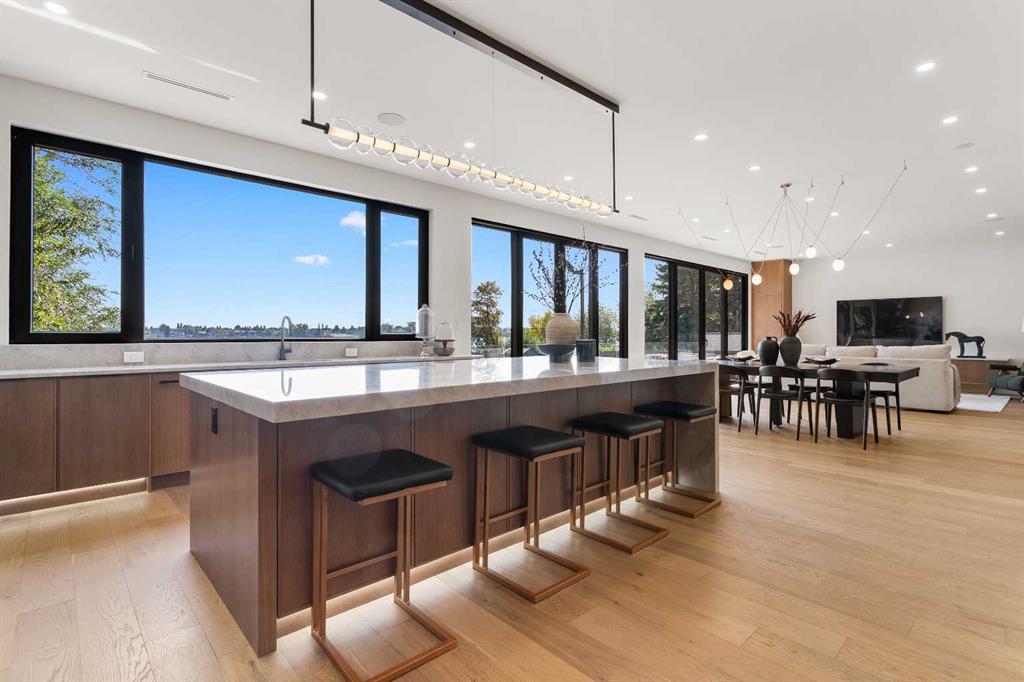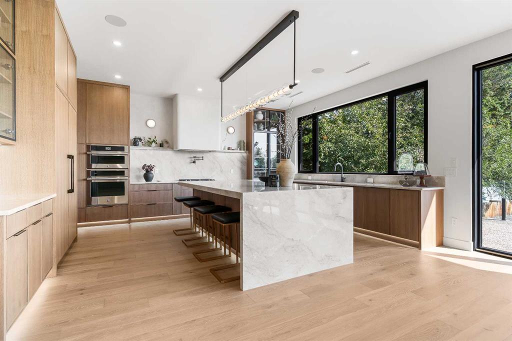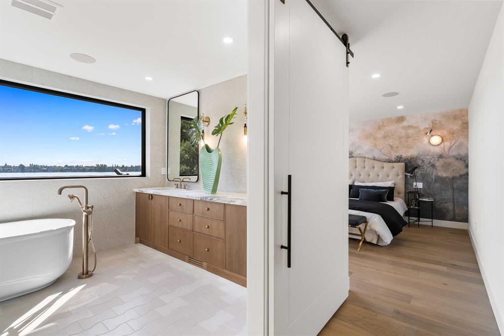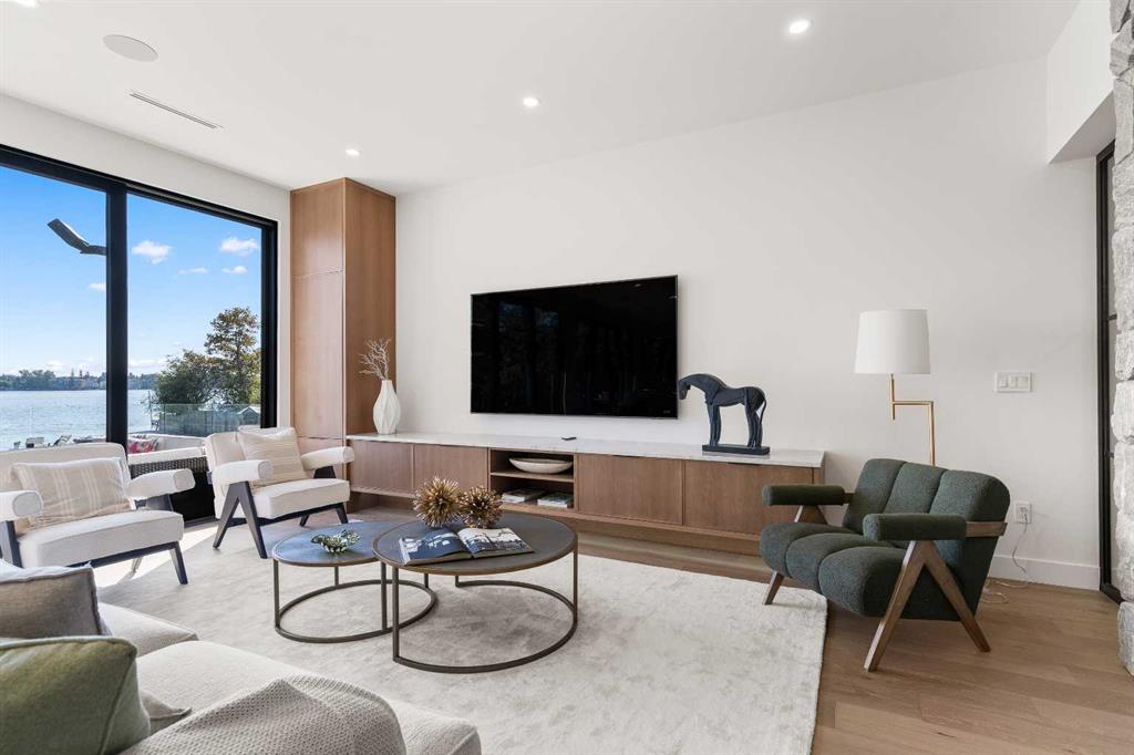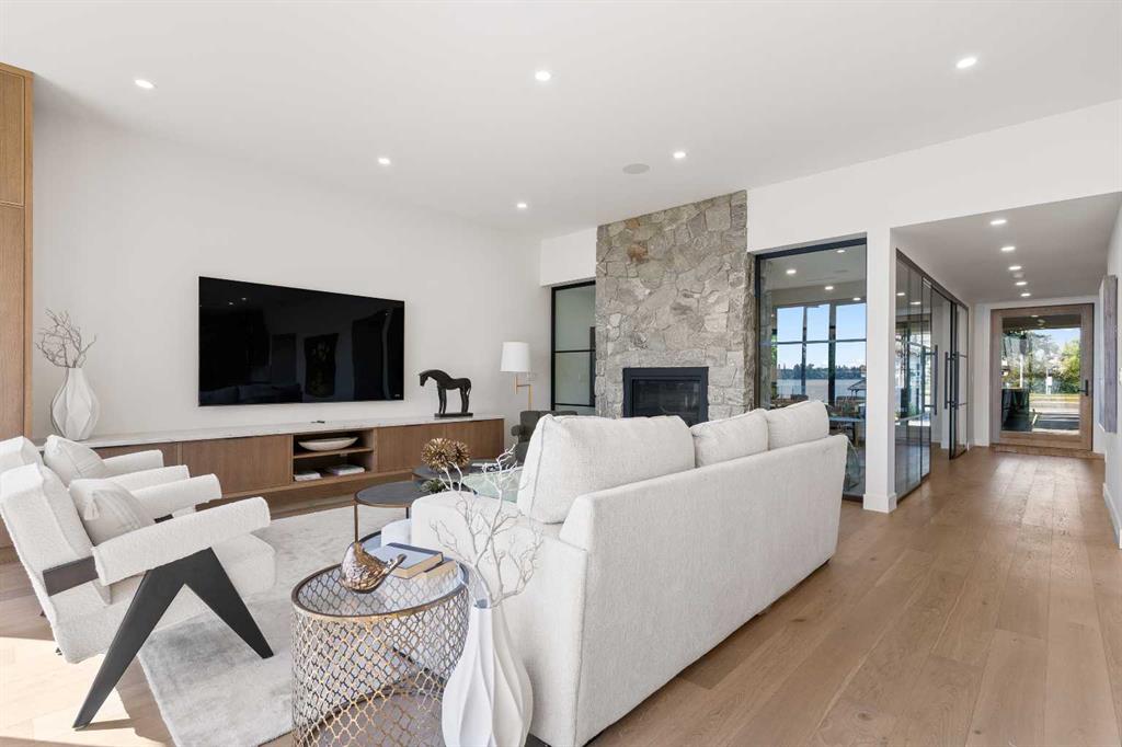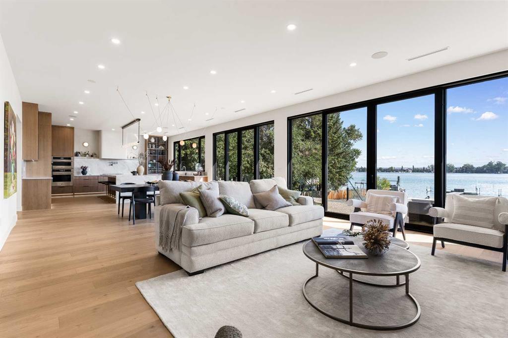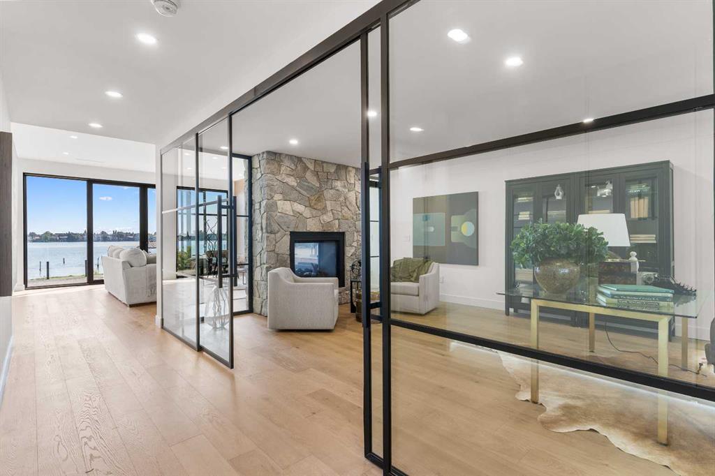 *Welcome to Lakeside Luxury on Chestermere Lake* With 4,482 sq. ft. of fully reimagined living space, this lakefront estate blends architectural sophistication with modern comfort on one of Chestermere Lake’s most exclusive stretches of shoreline. This complete renovation and design is an intricate remodel + extension, showcasing soaring 10’ ceilings, bespoke finishes, and walls of glass that capture sweeping water views. The foyer, framed by a 4 ft. Lux custom glass door, makes a bold first impression with a glass~encased home office and a see~through fireplace leading into the stunning living room. Floor~to~ceiling windows and European sliding doors create seamless flow to the outdoors, where a massive backyard, fire pit, and private dock invite year~round entertaining. At the heart of the home, the chef’s kitchen is a masterpiece ~ anchored by a Taj Mahal natural quartzite island, complemented by JennAir appliances, a butler’s pantry, and a limewashed plaster custom hood fan that compliments the natural stone backsplash. Brizo plumbing fixtures in champagne bronze + matte black, Lo & Co + Emtek hardware; and custom~designed lighting elevate every detail, while white oak cabinets and hardwood floors add warmth and texture throughout the home. A spacious mudroom that rivals the aesthetic of any competing luxury home, leads to the 4~car garage with a tucked~away workshop. The garage floor was transformed with a stunning, heated, metallic epoxy finish, providing both beauty and durability. LED sensors throughout the home create an unrivalled nighttime ambiance, and an exposed epoxy rear deck extends the entertaining space. Upstairs, a vaulted bonus room with the home’s original fireplace nods to its heritage, while a dual~desk workstation in the hallway adds functional elegance. Two secondary bedrooms and two larger master waterfront retreats capture lakeside serenity perfectly. The primary suite is pure indulgence, featuring a spa inspired ensuite with a steam shower, heated bench and floors, which flows seamlessly to a massive walk in closet with micro~shaker drawers and velvet encasements. Even the laundry room makes a statement, with classic black and white checkered flooring adding a charming and whimsical touch to this architectural marvel. This is more than a home ~ it’s a statement in design, craftsmanship, and lakefront living.