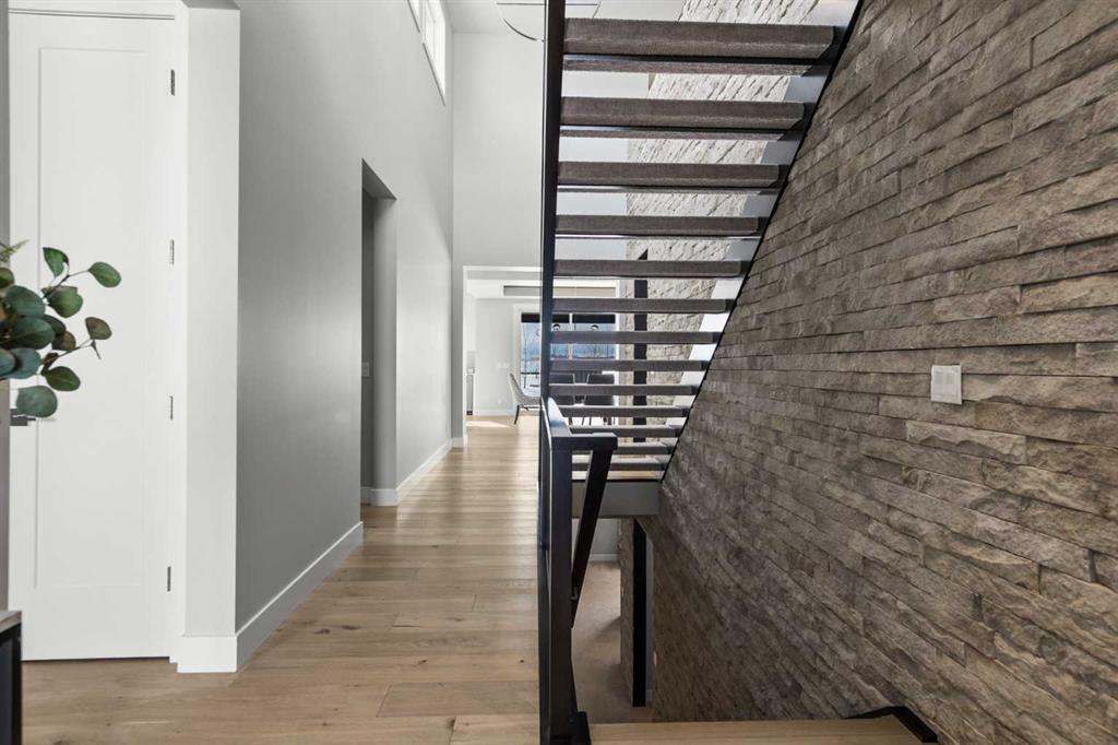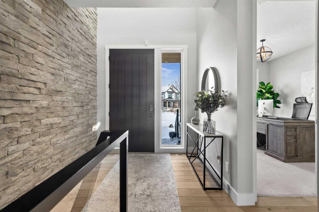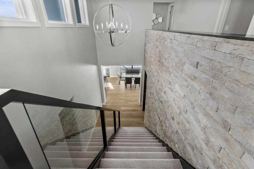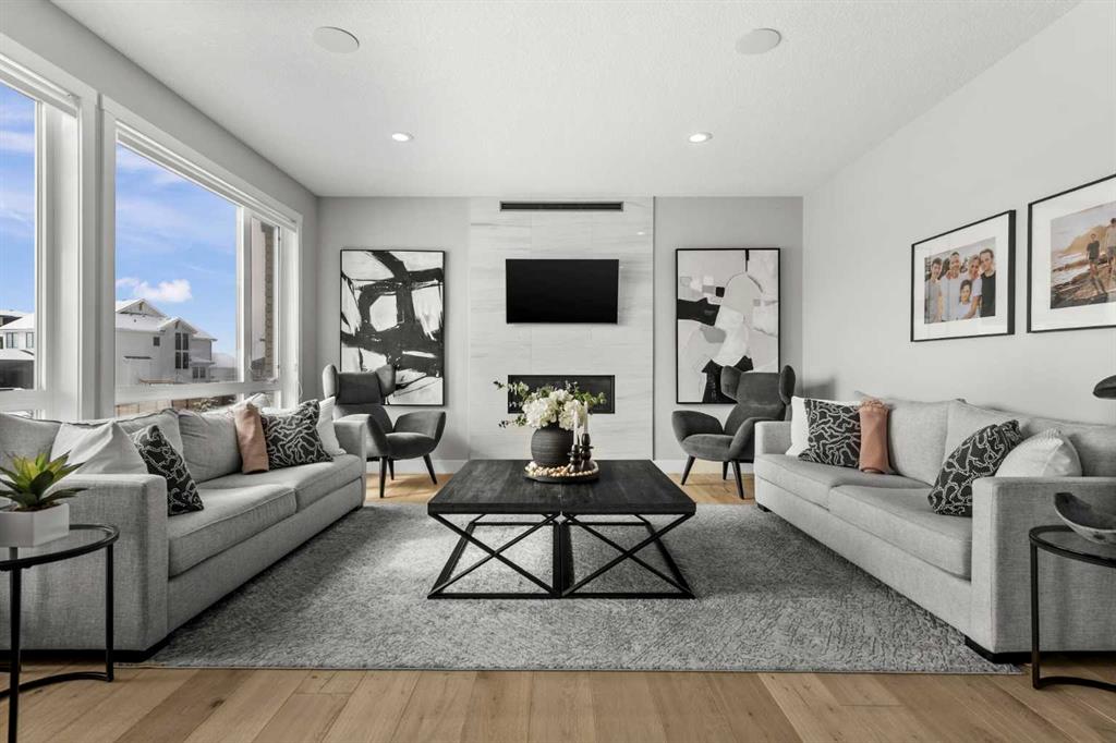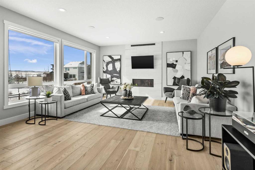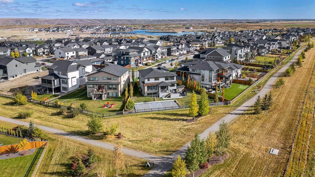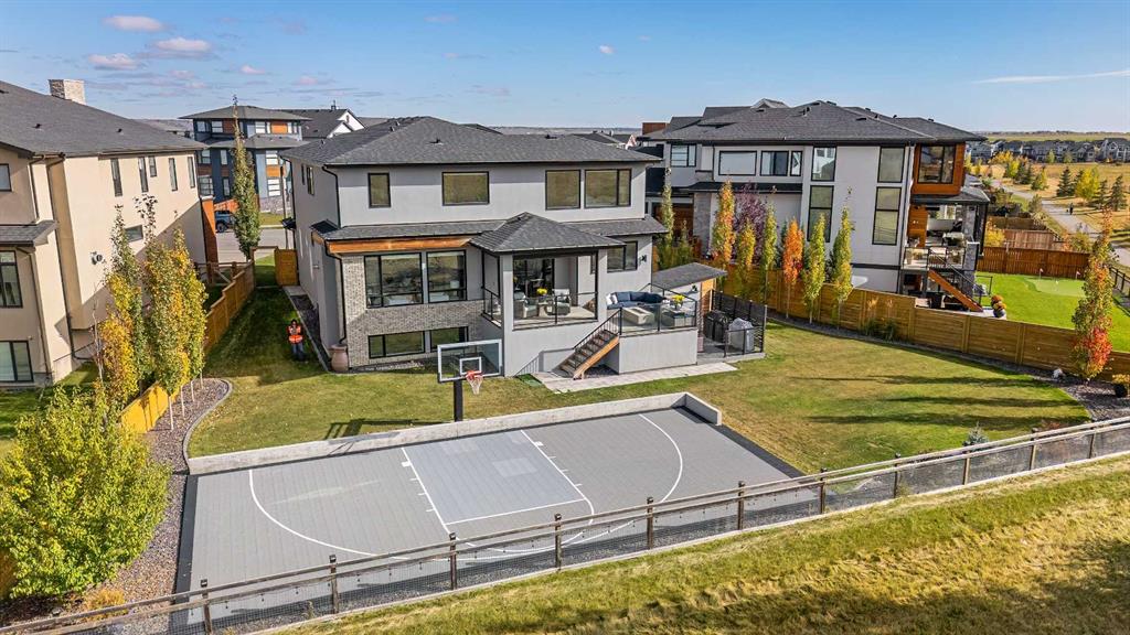 Set on one of the largest pie lots in Harmony and backing onto scenic pathways and open farmers’ fields, this exceptional home offers over 4,100 sq ft of developed living space while capturing unobstructed mountain views and breathtaking sunsets across the open landscape. Located on a quiet street within walking distance to the future school and a short distance to the lake, the setting offers an ideal balance of peaceful surroundings and everyday convenience. The home makes a striking first impression with a dramatic rock feature wall and open staircase drawing your eye through the main living spaces toward the backyard and views beyond. The main floor is bright and open with large windows filling the home with natural light while framing the landscape behind. At the heart of the home is an impressive kitchen featuring a premium Miele appliance package including gas cooktop, two dishwashers, quartz countertops, and a well-appointed butler’s pantry providing excellent prep and storage. Clean modern cabinetry and refined finishes give the kitchen a polished contemporary feel while the quartz island anchors the space and connects seamlessly with the dining and living areas. The dining area features a wood ceiling detail and designer lighting, while the living room is centred around a modern fireplace finished with tile detail and expansive windows overlooking the backyard and open landscape beyond. A private front office, powder room, and mudroom with built-in lockers and storage complete the main level. Upstairs, a spacious bonus room provides additional living space. The primary suite is a highlight of the home, positioned to capture the open views behind the property, with large windows framing farmland and expansive skies. The ensuite offers a freestanding tub, oversized glass shower, double vanity, and tile work, while the walk-in closet with built-ins connects directly to the laundry room. Two additional bedrooms and a full bathroom complete the upper level. The fully developed basement is designed for entertaining with a theatre area and custom bar featuring a waterfall island, beverage fridge, and double keg system. A dedicated home gym provides an excellent fitness space. The basement also includes a fourth bedroom, full bathroom, additional powder room, and storage. Outside, the backyard takes full advantage of the pie lot with a three-tier deck offering outdoor living areas including covered seating, a fire pit area, and outdoor cooking space, including a covered section with retractable electric blinds. A custom-built sport court creates an incredible space for basketball, pickleball or hockey. Additional features include an oversized tandem garage, underground irrigation, two air conditioning units, EV charging plug, cedar fencing, exterior shed, and built-in basement speakers. A rare opportunity to own a thoughtfully designed home on one of Harmony’s most desirable lots.