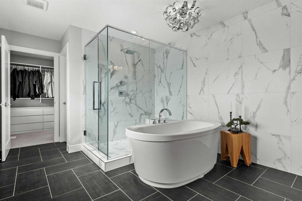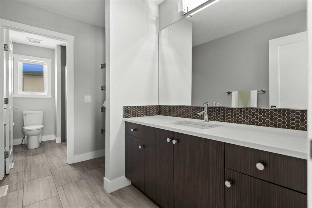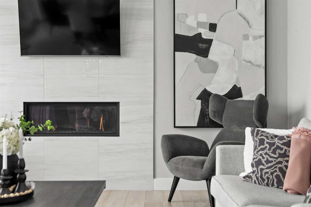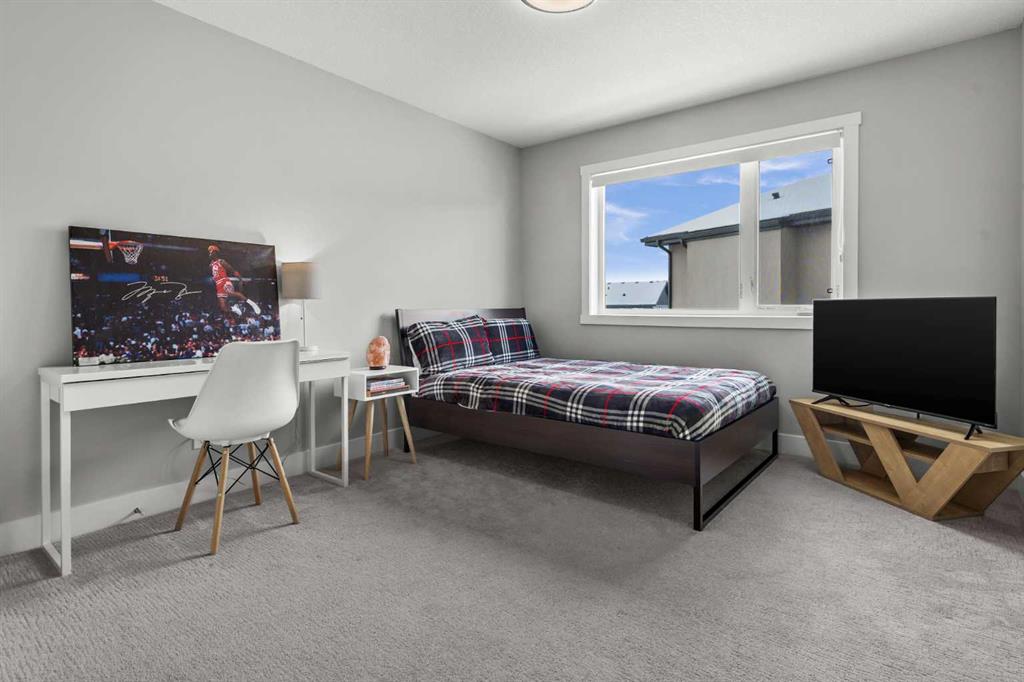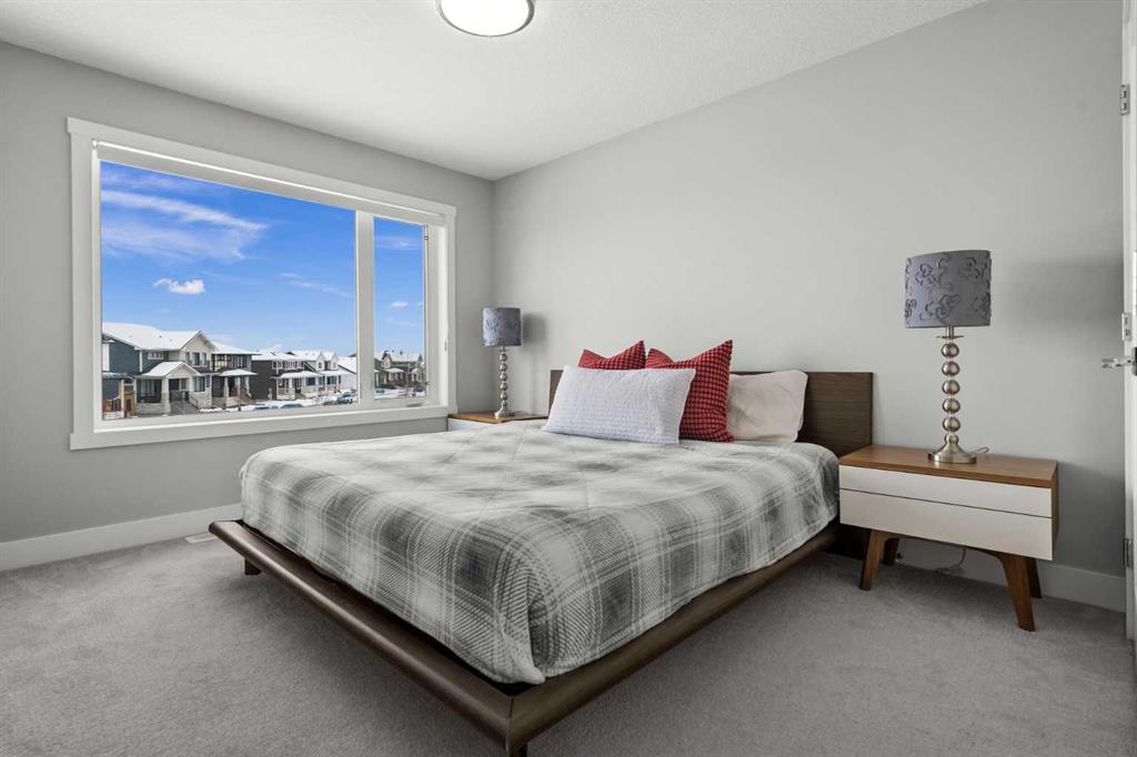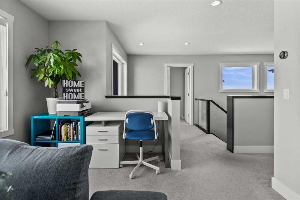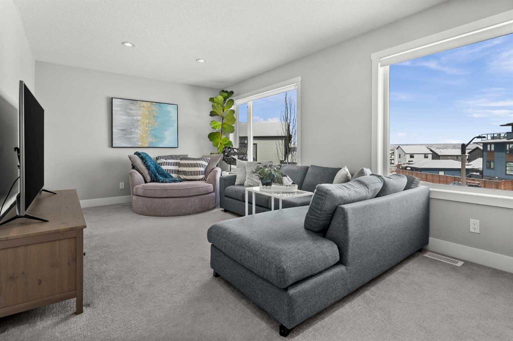 Set on one of the largest pie lots in Harmony and backing onto scenic pathways and open farmers’ fields, this exceptional home offers over 4,100 sq ft of developed living space while capturing unobstructed mountain views and breathtaking sunsets across the open landscape. Located on a quiet street within walking distance to the future school and a short distance to the lake, the setting offers an ideal balance of peaceful surroundings and everyday convenience. The home makes a striking first impression with a dramatic rock feature wall and open staircase drawing your eye through the main living spaces toward the backyard and views beyond. The main floor is bright and open with large windows filling the home with natural light while framing the landscape behind. At the heart of the home is an impressive kitchen featuring a premium Miele appliance package including gas cooktop, two dishwashers, quartz countertops, and a well-appointed butler’s pantry providing excellent prep and storage. Clean modern cabinetry and refined finishes give the kitchen a polished contemporary feel while the quartz island anchors the space and connects seamlessly with the dining and living areas. The dining area features a wood ceiling detail and designer lighting, while the living room is centred around a modern fireplace finished with tile detail and expansive windows overlooking the backyard and open landscape beyond. A private front office, powder room, and mudroom with built-in lockers and storage complete the main level. Upstairs, a spacious bonus room provides additional living space. The primary suite is a highlight of the home, positioned to capture the open views behind the property, with large windows framing farmland and expansive skies. The ensuite offers a freestanding tub, oversized glass shower, double vanity, and tile work, while the walk-in closet with built-ins connects directly to the laundry room. Two additional bedrooms and a full bathroom complete the upper level. The fully developed basement is designed for entertaining with a theatre area and custom bar featuring a waterfall island, beverage fridge, and double keg system. A dedicated home gym provides an excellent fitness space. The basement also includes a fourth bedroom, full bathroom, additional powder room, and storage. Outside, the backyard takes full advantage of the pie lot with a three-tier deck offering outdoor living areas including covered seating, a fire pit area, and outdoor cooking space, including a covered section with retractable electric blinds. A custom-built sport court creates an incredible space for basketball, pickleball or hockey. Additional features include an oversized tandem garage, underground irrigation, two air conditioning units, EV charging plug, cedar fencing, exterior shed, and built-in basement speakers. A rare opportunity to own a thoughtfully designed home on one of Harmony’s most desirable lots.