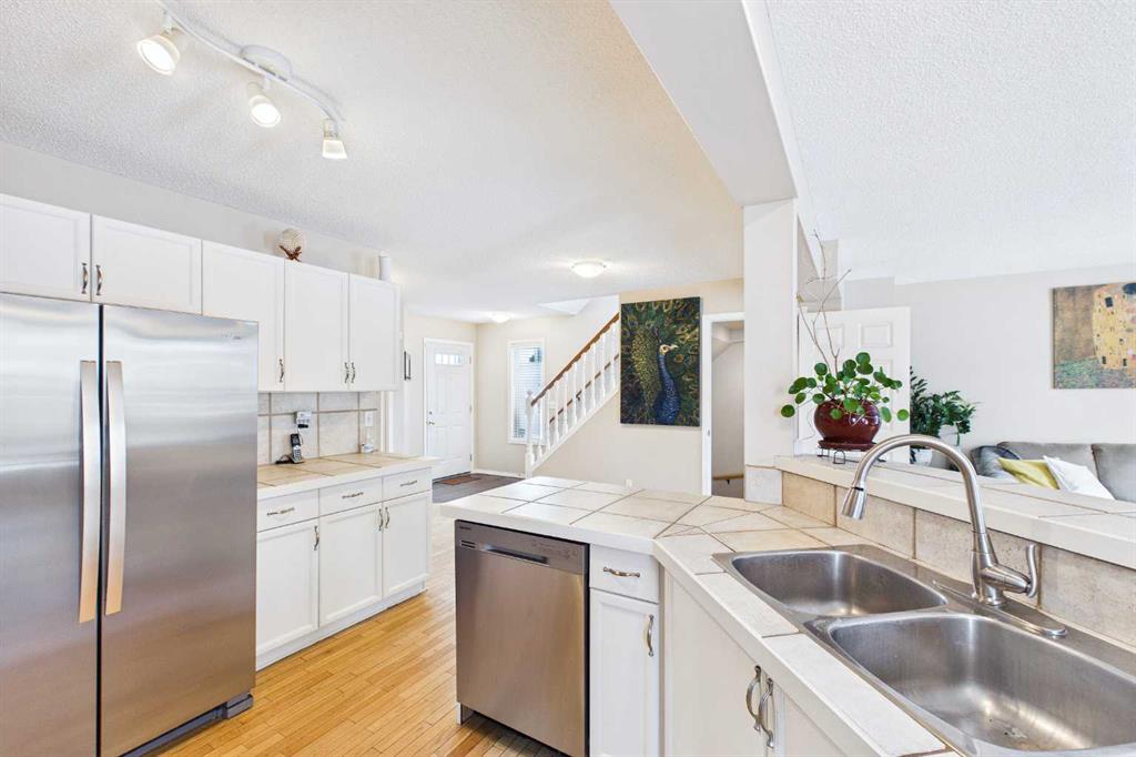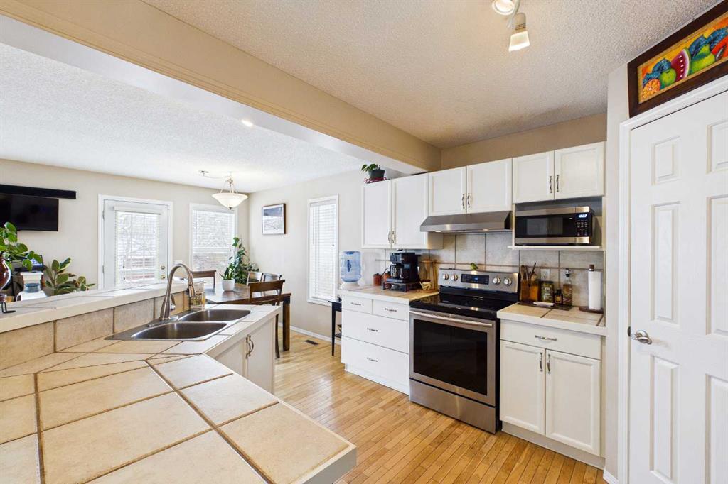 Pride of ownership shines throughout this beautifully maintained home, ideally located on a quiet street just steps from the wetlands and nature sanctuary. With its exceptional condition and inviting atmosphere, this property offers the perfect blend of comfort, functionality, and location. The main floor features beautiful hardwood flooring throughout the living room, dining area, and kitchen, complemented by neutral paint tones . The kitchen offers durable tile countertops, chrome hardware, and plenty of workspace, making it both practical and welcoming. Upstairs, the spacious primary bedroom includes a walk-in closet and a full ensuite bathroom with a relaxing jetted tub. Step outside to enjoy the sunny south-facing backyard, complete with a large deck and mature trees, creating the perfect space for outdoor entertaining or relaxing in privacy. The fully finished basement expands the living space with a fourth bedroom, a 3-piece bathroom with an oversized shower, and a convenient dry bar, making it ideal for guests, teens, or extended family. With newer shingles (2022) updated appliances, and an insulated garage, this home is truly move-in ready and offers outstanding value for families looking to live close to nature while still enjoying all the conveniences of the community.